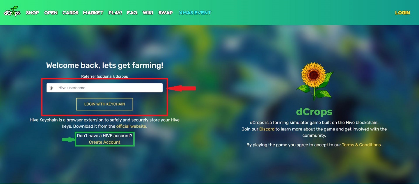 :round\_pushpin:Once this done \[or if you are an existing Hive user],  simply visit [*<mark style="color:blue;">**www.dCrops.com/**</mark>*](https://app.gitbook.com/u/4JSNHmCz9ZS2w2pTTccsJWhuizh1) to <mark style="color:orange;">**Login**</mark> by typing in your <mark style="color:red;">**Hive Username**</mark> and clicking on <mark style="color:red;">**Login with Hive Keychain**</mark>**.**&#x20;