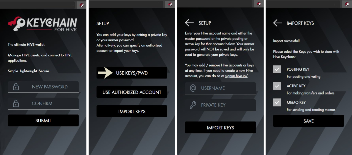 <mark style="color:red;">**Hive Keychain**</mark> is a browser extension for use on computers, and a mobile-app for smartphones. It can hold your Hive Keys in encrypted form and '<mark style="background-color:yellow;">**SIGN'**</mark> transactions on the blockchain for you. That prevents you from having to copy/paste your Keys each time you login or need to confirm a transaction.&#x20;